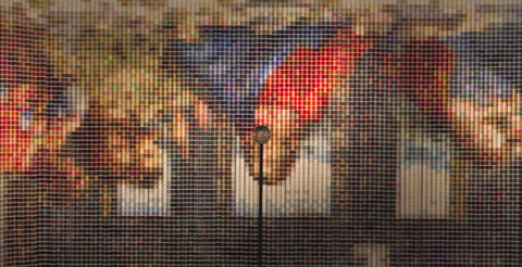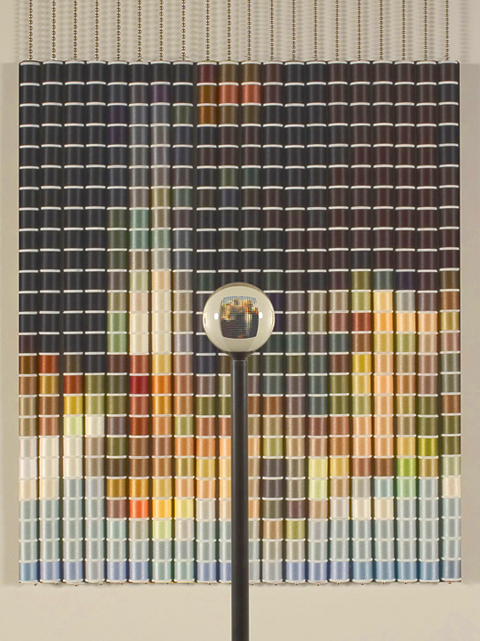 ” I am interested in the link between art, science, and technology, how the eyes and brain prioritize, and reality as a subjective experience vs. an absolute truth. As a visual artist, I cannot think of a topic more stimulating and yet so basic, than the act of seeing–how the human brain makes sense of the visual world. My current body of work consists of sculptures assembled from thousands of ordinary objects -spools of thread, marker-pen caps, map tacks, or chenille stems, combined with optical devices such as clear acrylic viewing spheres, convex mirrors, or reversed binoculars. I place equal emphasis on the whole recognizable image and how the individual parts function as abstract elements, selecting materials based on aesthetic and functional characteristics as well as for their capacity for a compelling and often contrasting relationship with the subject matter.” –